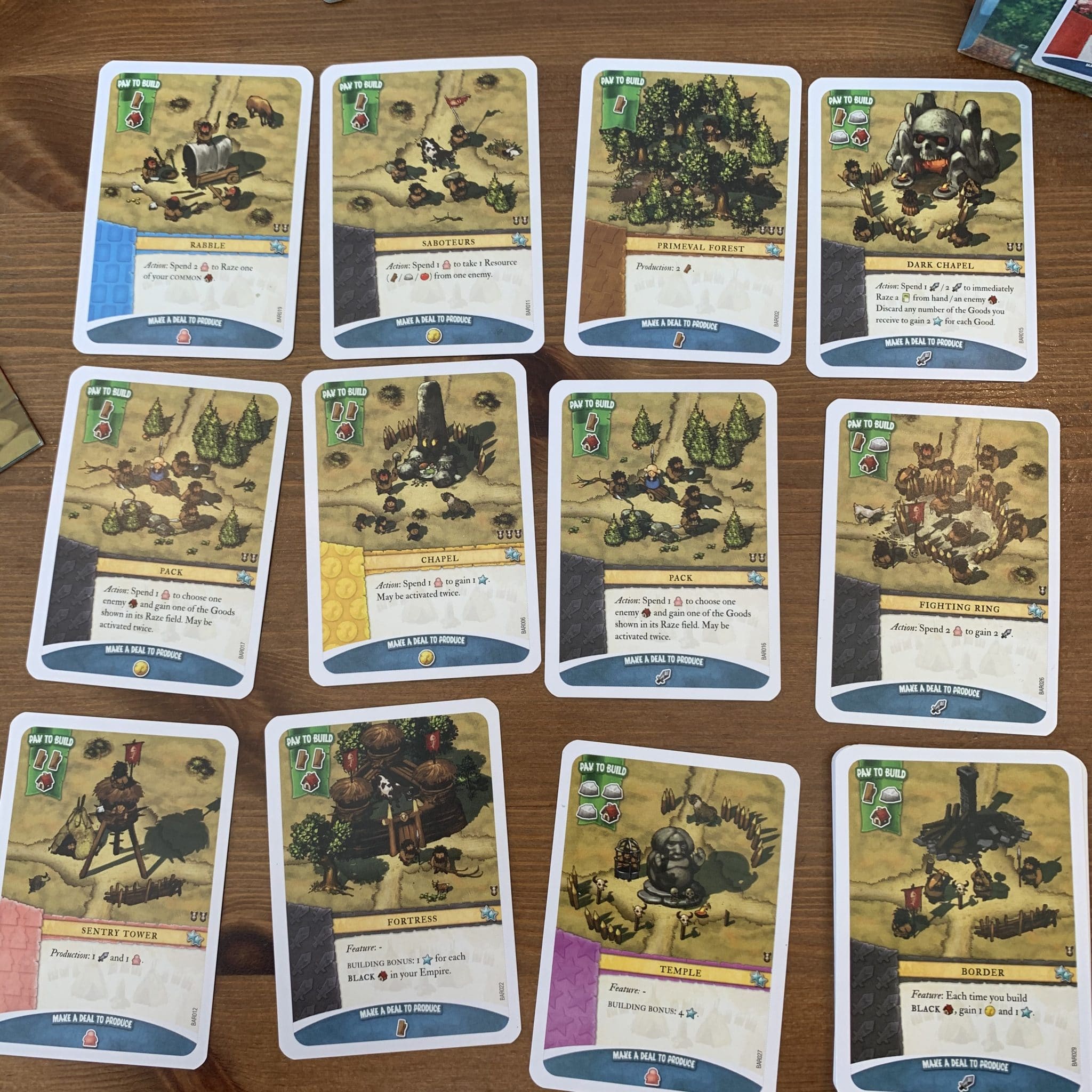 It’s the “Raze” action that upends this. A player can choose to raze a building (card), which gives a one-time collection of resources but means that card is out of play in the future.